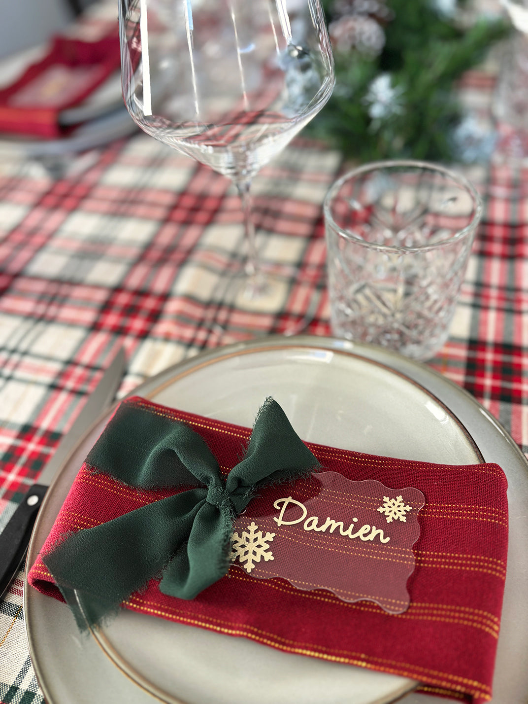 Un joli marque-place personnalisé avec le prénom de votre invité, la couleur d’écriture de votre choix et un nœud en ruban assorti.